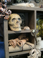 ....charms, a bottle........ some rolled up canvas (fabric... see? )...... a small twig with tiny skulls hanging fom it..... i made tiny bandages so my mummy would have a few 'spares'....(more fabric!) and a brooch in the bottom centre hole......