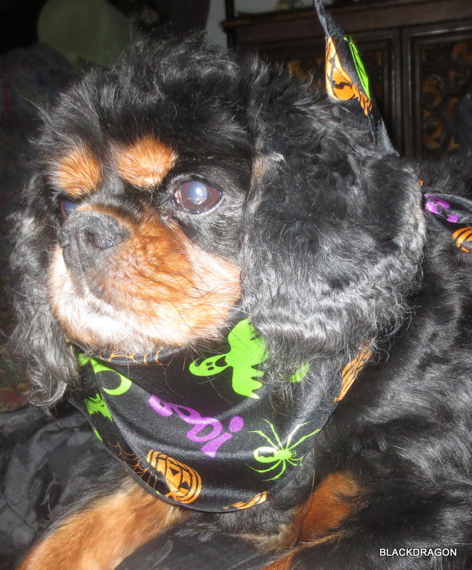This is my old CKC spaniel...Syd.... wearing his Hallowe'en bandana....